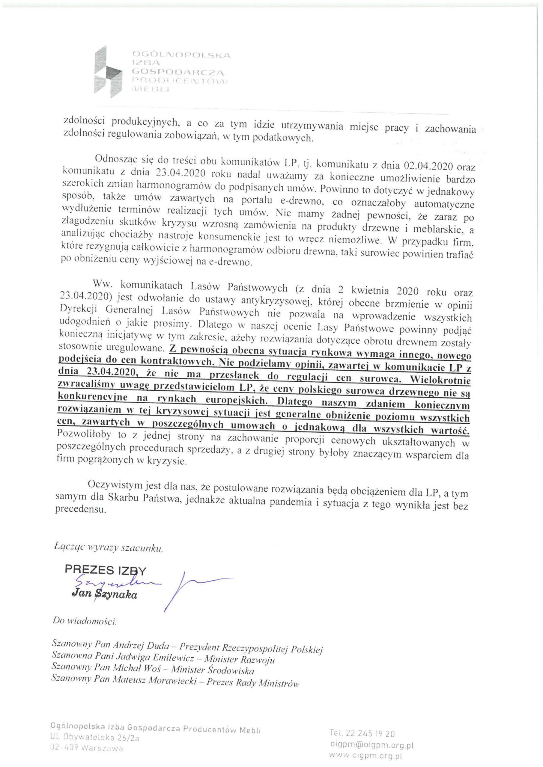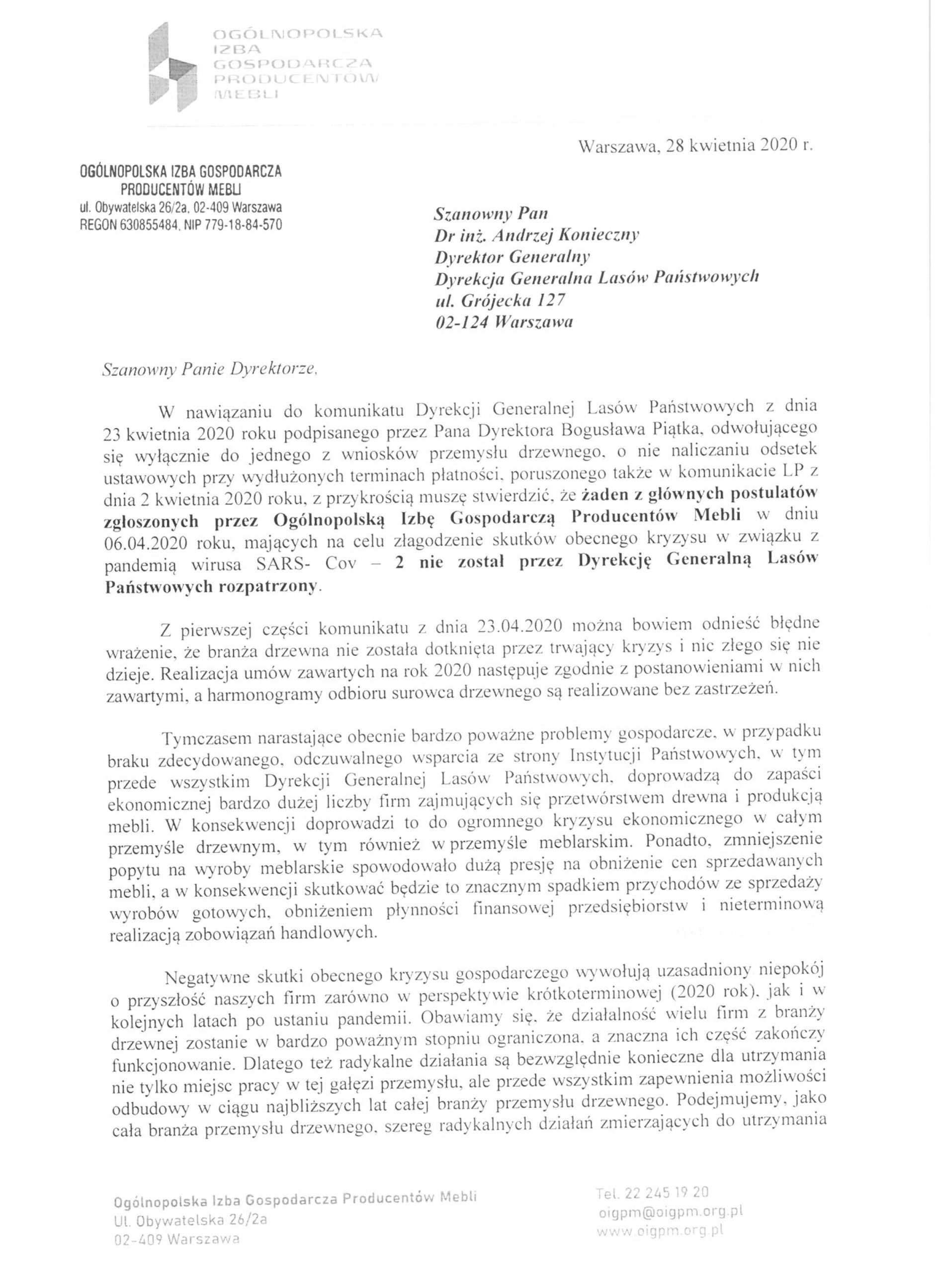 W związku z brakiem rozpatrzenia przez Dyrekcję Lasów Państwowych poprzednich postulatów Prezesa OIGPM, Pana Jana Szynaki, dnia 28 kwietnia 2020 roku skierowane zostało kolejne pismo apelujące o pomoc do Generalnej Dyrekcji Lasów Państwowych.