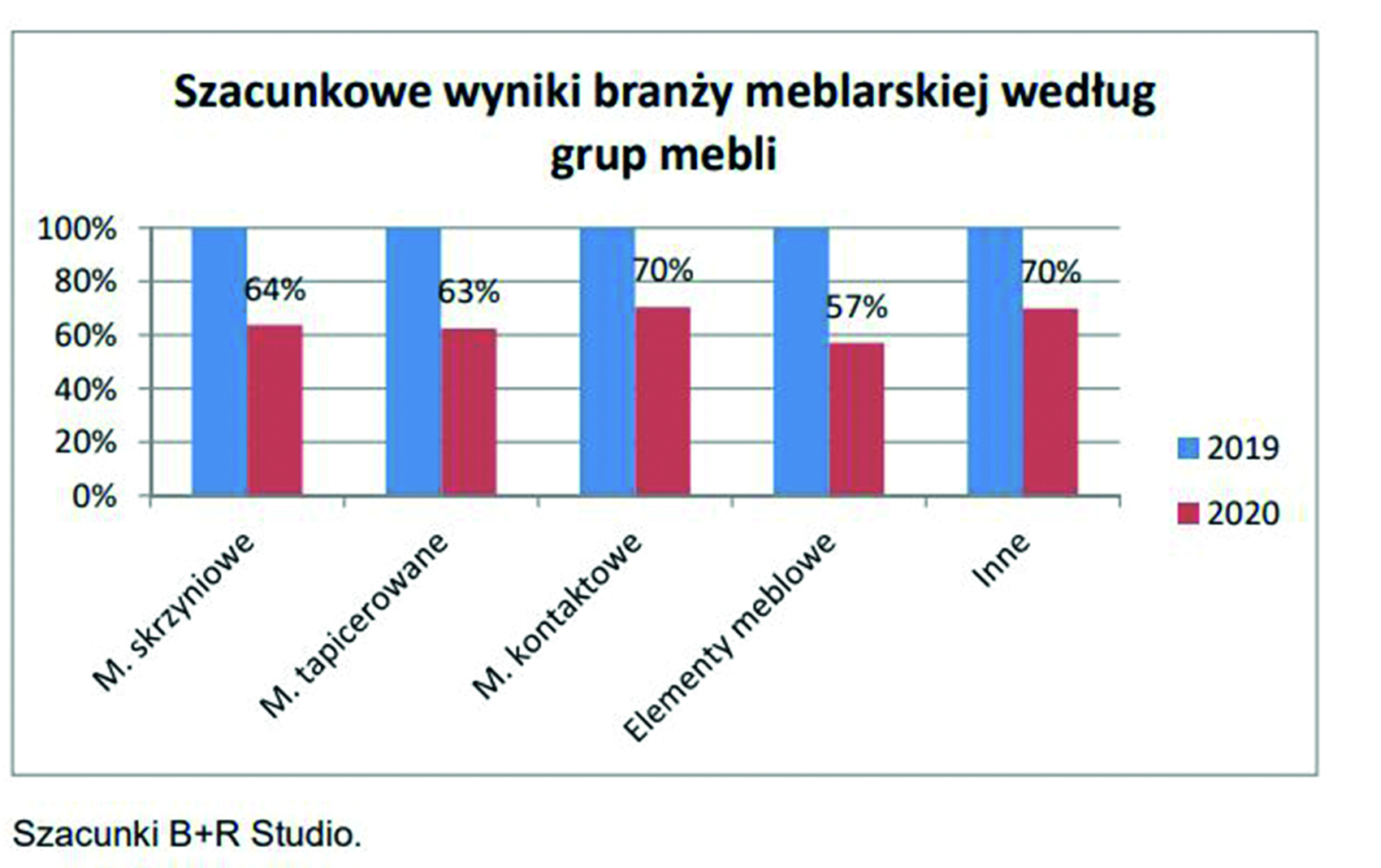 – nie będzie powtórnej fali wirusa na jesieni. Szacowany wynik produkcji sprzedanej branży meblarskiej w 2020 roku wyniesie zaledwie 33 miliardy złotych wobec 50,5 mld w 2019 roku co oznacza spadek o 35%!