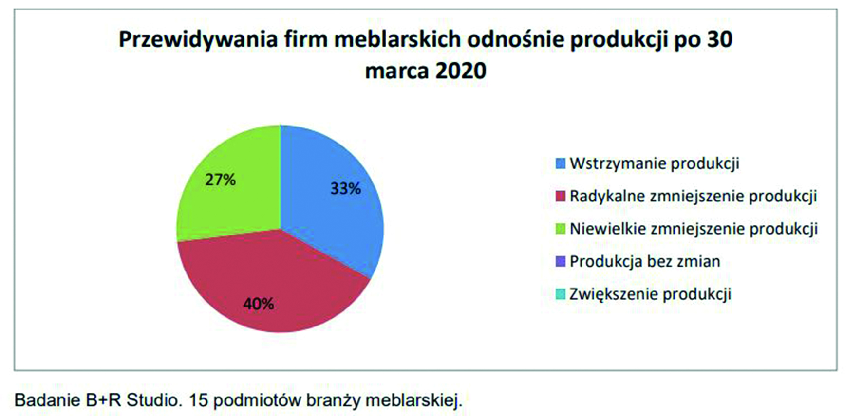 Aż 33% badanych wskazało, że zawiesza produkcję w kolejnym tygodniu – w większości są to firmy duże pracujące dla sieci handlowych. 40% firm zadeklarowało radykalne zmniejszenie produkcji, a 27% niewielkie zmniejszenie produkcji. Firmy działające na rynkukontraktowym i realizujące produkcję pod zlecenia posiadają portfel zamówień na 3-4 tygodnie, rzadko na dłużej, ale z uwagi na dynamiczną sytuację obawiają się o wycofywanie zleceń i uregulowanie zobowiązań za wykonane meble.
