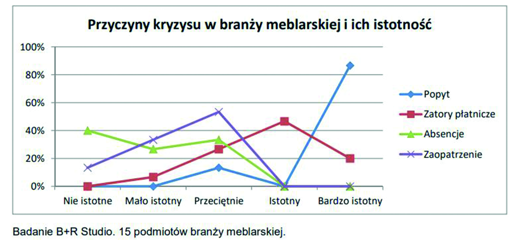 Powodem kryzysu w branży meblarskiej jest brak popytu wynikający z zakazu handlu, zaleceń pozostania w domach i nagłym spadku wskaźników ufności konsumenckiej. Odcięcie popytu było najistotniejszym problemem dla wszystkich ankietowanych.