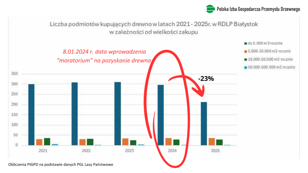 Skutki moratorium są widoczne w statystykach. W Regionalnych Dyrekcjach Lasów Państwowych (RDLP) w Krośnie i Białymstoku liczba przedsiębiorstw kupujących do 5.000 m³ drewna rocznie spadła aż o 22% w ciągu zaledwie jednego roku. To oznacza, że niemal co czwarta firma działająca w branży drzewnej zniknęła z rynku, pozostawiając po sobie nie tylko puste miejsca pracy, ale także straty dla całej lokalnej gospodarki.